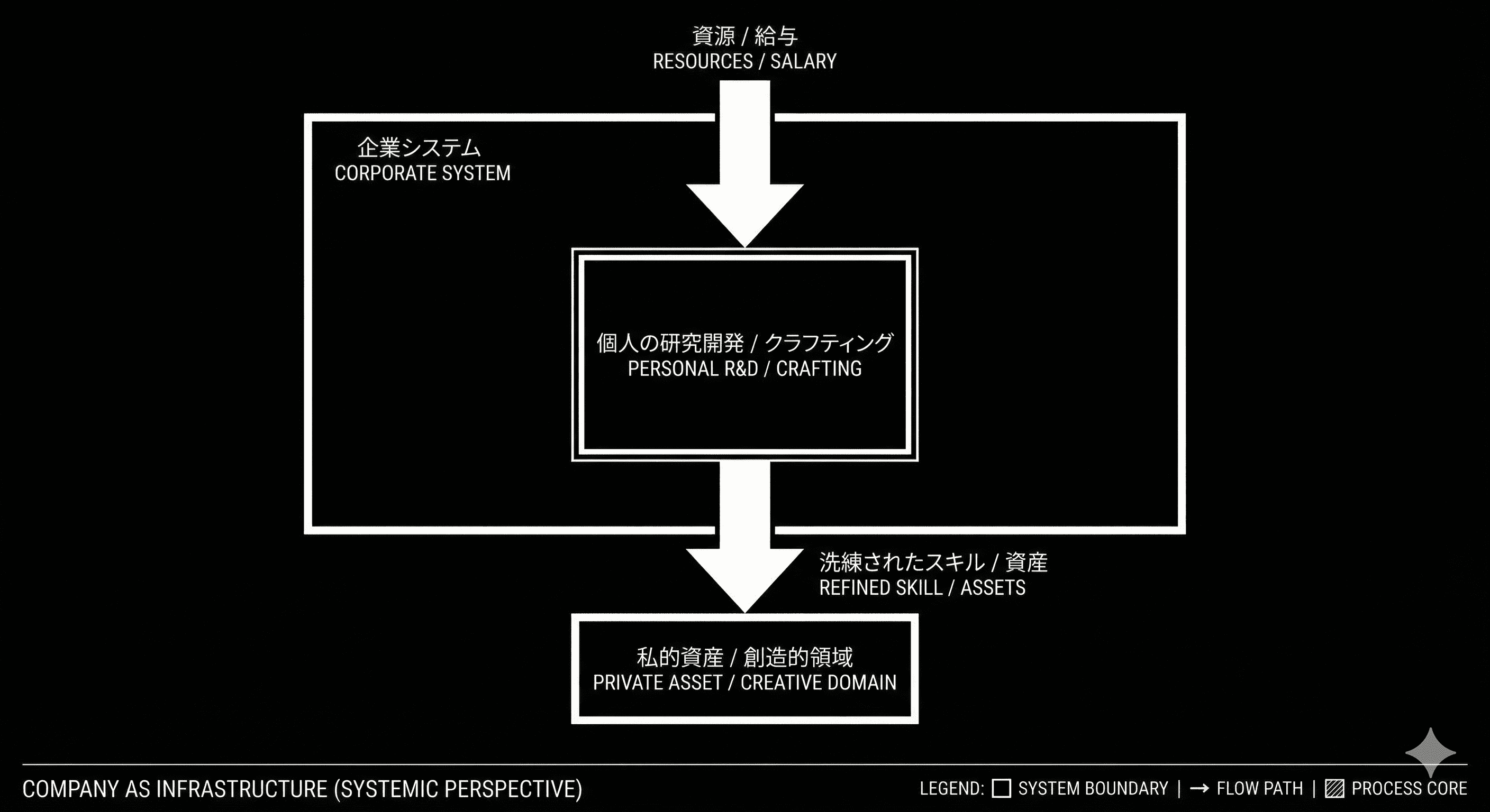 第三に、自己給与システムの構築。個人の余剰資金を自らの仕組みに再投資し、そこから得られるリターンで生活を賄うシミュレーションを常に行うことです。業務の効率化や自動化を通じて創出した余剰時間を、自らの発信やプロダクト開発を静かに、かつ執拗に進めるための時間へと充当してください。