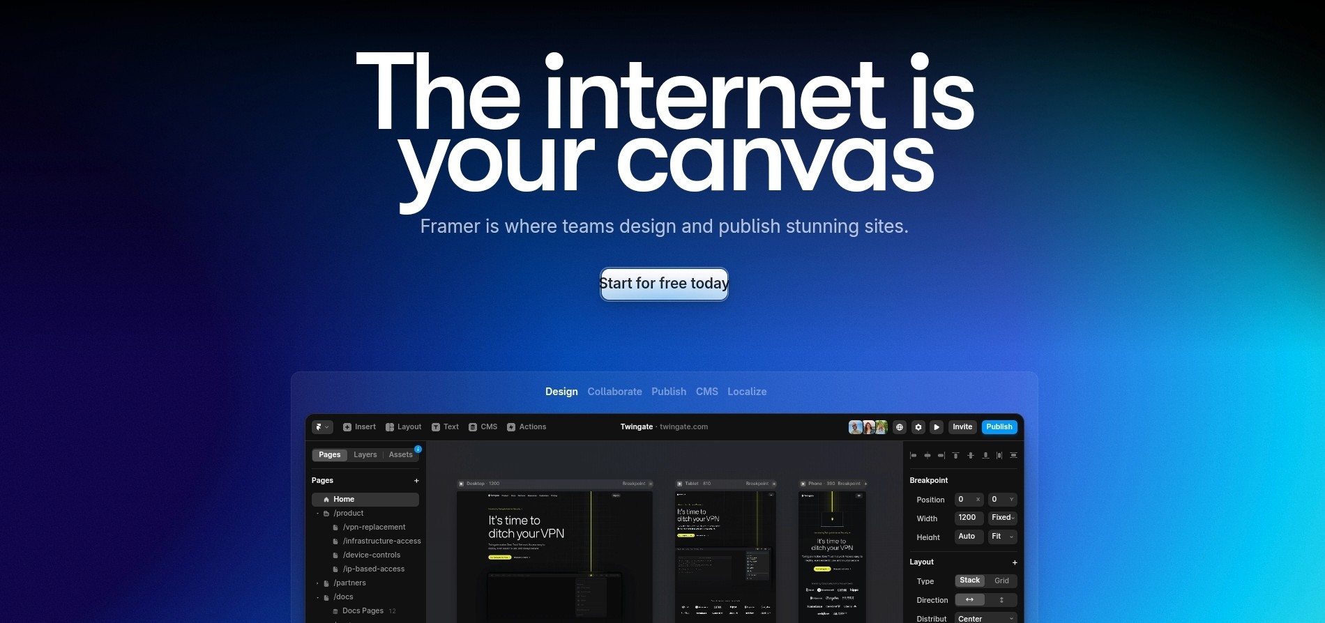 A new icon has been added to the canvas toolbar in Framer, allowing you to toggle between dark and light modes. This feature updates the app UI and all the color styles to their respective themes, enabling you to preview your website in each theme without having to publish it. This functionality extends beyond web pages, even allowing you to design canvas elements that are legible and appealing in both modes.